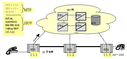 如下圖所示,當(dāng)一個用戶摘機并拔被叫號碼,交換局(SSP1)收集并分析被叫號碼,分析到被叫不是本局內(nèi)用戶,而是目的信令點編碼為1.1.3交換局的用戶,于是,SSP1在路由表中查找到達(dá)1.1.3的路由,然后用找到的鏈路把IAM消息發(fā)送出去,如圖中箭頭所示。