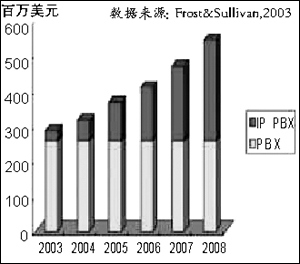 這幾年,IP電話的需求在不斷升溫,尤其在2003年呈快速增長趨勢(shì)。目前,全球IP電話市場容量每年為10億美元,預(yù)計(jì)到2008年,IP電話的市場份額將超過傳統(tǒng)的PBX。據(jù)思科公司溫帶策經(jīng)理介紹,思科在前4年,向全球銷售了100萬臺(tái)IP電話,而在2003財(cái)年僅僅一年時(shí)間里,就銷售了100萬臺(tái)IP電話。