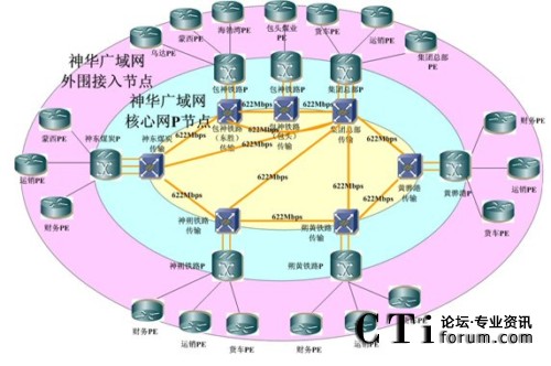 據(jù)神華集團(tuán)信息管理部廣域網(wǎng)項(xiàng)目負(fù)責(zé)人說:“該項(xiàng)目建成后將是一個(gè)建設(shè)在高速傳輸網(wǎng)平臺(tái)之上,并利用其提供的線路構(gòu)成廣域網(wǎng)核心節(jié)點(diǎn)之間的互聯(lián)線路,網(wǎng)絡(luò)拓?fù)湓?個(gè)核心節(jié)點(diǎn)和以北京節(jié)點(diǎn)為中心直連7個(gè)核心節(jié)點(diǎn)的放射型622M環(huán)形+放射混合性企業(yè)頂級(jí)骨干廣域數(shù)據(jù)網(wǎng)絡(luò)結(jié)構(gòu)。該網(wǎng)絡(luò)結(jié)構(gòu)可避免任一段光纜中斷造成某節(jié)點(diǎn)直連線路和環(huán)線同時(shí)中斷的可能性,即對(duì)網(wǎng)絡(luò)單點(diǎn)故障實(shí)現(xiàn)環(huán)路保護(hù)。同時(shí),網(wǎng)絡(luò)中斷到恢復(fù)的周期大大縮短:傳輸系統(tǒng)中SDH的環(huán)路自愈從中斷到恢復(fù)周期為50ms,網(wǎng)絡(luò)節(jié)點(diǎn)之間通過IGP的路由收斂,從中斷到恢復(fù)的周期約為200ms!