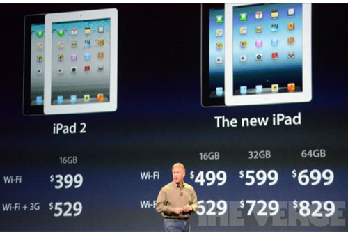 此次發(fā)布的新一代iPad分別為WiFi版16G/32G/64G,價(jià)格分別為499美元/599美元/699美元。同時(shí)蘋果新一代iPad還發(fā)布了LTE版本,同時(shí)向下支持HSPA+網(wǎng)絡(luò),其中16G/32G/64G,價(jià)格分別為629美元/729美元/829美元。