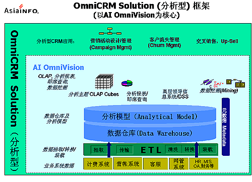 OmniCRM方案是亞信基于多年服務(wù)電信市場的豐富的行業(yè)經(jīng)驗,以及對國內(nèi)運營商業(yè)務(wù)發(fā)展的深刻認(rèn)識而推出的,其中,AI OmniVision是OmniCRM方案中經(jīng)營分析型CRM 的核心產(chǎn)品。AI OmniVision不僅符合行業(yè)業(yè)務(wù)規(guī)范,而且基于對客戶行為、競爭環(huán)境,商業(yè)獲利率以及其他參數(shù)的透徹分析,能夠使運營商充分了解現(xiàn)有客戶、識別并關(guān)注贏利的客戶組、提高服務(wù)質(zhì)量、確保客戶滿意度和忠誠度;同時吸引潛在的客戶;加強提供新服務(wù)的投資回報率;提高效率、減小成本,以實現(xiàn)業(yè)務(wù)價值的最大化。AI OmniVision采用數(shù)據(jù)倉庫、ETL、OLAP分析、靈活報表展現(xiàn)及數(shù)據(jù)挖掘等技術(shù),包含了用戶分析、業(yè)務(wù)分析、收益分析、大客戶分析、營銷分析、競爭分析、服務(wù)質(zhì)量、新業(yè)務(wù)分析等眾多功能模塊。