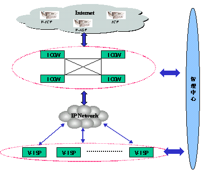 整個語音互聯網由V-ISP接入服務平臺、ICGW信息控制關口、V-ICP內容提供平臺、管理平臺四部分組成。這四部分分別完成不同的功能。