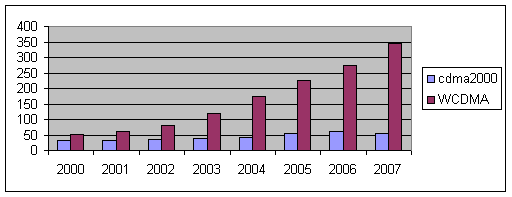 2000年,3G市場(chǎng)收入在cdma2000(大約31億美元,占38%)與WCDMA(大約50億美元,占62%)分布為1/3比2/3。我們不難看出,這種變化有利于WCDMA。到2007年,預(yù)計(jì)WCDMA將占全部市場(chǎng)收入的86%。這是由于對(duì)于WCDMA,運(yùn)營(yíng)商需要增加支出來(lái)將其網(wǎng)絡(luò)升級(jí)為GPRS、EDGE與WCDMA。同時(shí),在預(yù)測(cè)期內(nèi),TDMA運(yùn)營(yíng)商最終要將其所有現(xiàn)存的TDMA與模擬特性升級(jí)為GSM/GPRS。相比之下,CDMA運(yùn)營(yíng)商處于良好的狀態(tài),其現(xiàn)有基礎(chǔ)設(shè)施的大部分軟件已經(jīng)升級(jí)。CDMA運(yùn)營(yíng)商,如Verizon,確實(shí)也有模擬特性,但是較之GSM/TDMA而言,它們要低得多。CDMA運(yùn)營(yíng)商支出的大部分將以新的Cell sites的形式出現(xiàn)的覆蓋率。