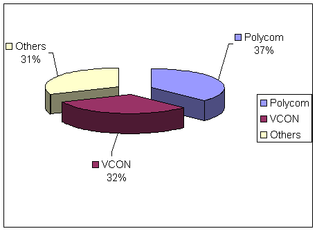 表4和圖3顯示了2001年桌面視頻會(huì)議市場(chǎng)競(jìng)爭(zhēng)廠(chǎng)商銷(xiāo)售額市場(chǎng)份額,表2和圖2顯示了銷(xiāo)售量的市場(chǎng)份額。隨著新產(chǎn)品的和新廠(chǎng)商的進(jìn)入,競(jìng)爭(zhēng)態(tài)勢(shì)將在未來(lái)不斷變化。目前該市場(chǎng)上兩個(gè)最大的廠(chǎng)商是Polycom和VCON, 其他一些小廠(chǎng)商市場(chǎng)份額較小。