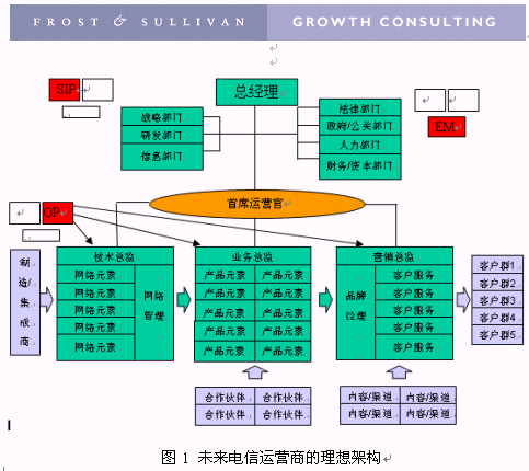 Frost & Sullivan(中國(guó))公司深入研究國(guó)際主流運(yùn)營(yíng)商的組織結(jié)構(gòu)與管理模式,同時(shí)參考了國(guó)際上公認(rèn)的eTOM模型,并結(jié)合國(guó)內(nèi)電信運(yùn)營(yíng)商組織結(jié)構(gòu)的現(xiàn)狀,提出了圖1所示的未來電信運(yùn)營(yíng)商的理想架構(gòu)。理想架構(gòu)的確定對(duì)電信運(yùn)營(yíng)管理的變革具有重要的意義。只有事先明確了方向,并且對(duì)未來達(dá)成了廣泛一致的共識(shí),才能對(duì)目標(biāo)過程進(jìn)行分解,有步驟、有方法、有成效的完成目標(biāo)。
