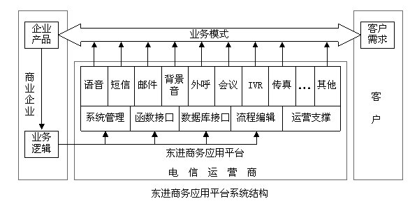 東進商務應用平臺能同時滿足電信運營商和商業(yè)企業(yè)的業(yè)務需求。平臺融合了電信網、互聯網和內部辦公網,整合了電信運營商和商業(yè)客戶的業(yè)務需求,利用國內所有基礎運營商(包括中國網通、中國電信、中國移動、中國聯通、中國鐵通)的通信終端,通過電話語音、短信和傳真等方式與客戶或服務對象進行溝通。商業(yè)企業(yè)能根據自身的工作流程和業(yè)務邏輯,充分利用自身的客戶數據庫和員工數據庫,進行低成本、高效率的服務溝通,實現企業(yè)服務、營銷和管理等方面高效運轉,提升核心競爭力和服務滿意度。同時,電信運營商業(yè)增加了話務量,實現了增量亦增收、提升了arpu值。