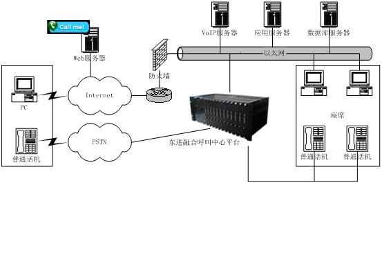 to Talk)”發(fā)展到“點(diǎn)擊到交談(Click to Talk)”,通過Internet可以提供IP電話語音呼叫、Call Back、IP傳真、IM、E-mail等功能,擴(kuò)展了通信渠道,一方面用戶可以實(shí)現(xiàn)免費(fèi)接入到呼叫中心,另一方面企業(yè)能夠向更多的客戶提供優(yōu)質(zhì)、方便的服務(wù)資源,而且由于這些資源的價(jià)格相對(duì)傳統(tǒng)通信便宜,使企業(yè)為客戶提供全國(guó)、乃至于全球服務(wù)成為可能,提高了企業(yè)客戶服務(wù)水平,增強(qiáng)了企業(yè)競(jìng)爭(zhēng)力。東進(jìn)互聯(lián)網(wǎng)呼叫中心系統(tǒng)結(jié)構(gòu)如圖所示: