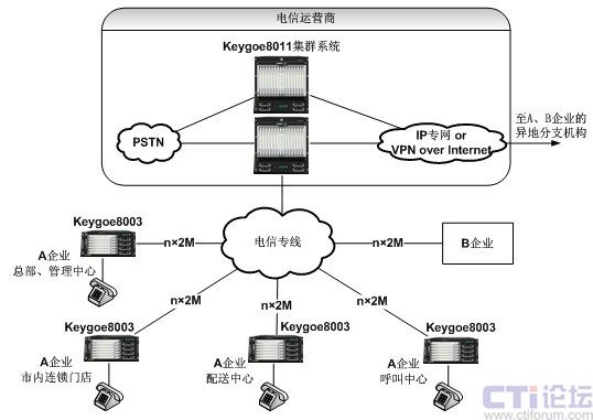 電信運營商在核心機房部署由東進Keygoe系列多媒體交換機組成的高性能集群交換機系統(tǒng),各個企業(yè)以及各企業(yè)的市內(nèi)分支機構(gòu)(如管理中心、連鎖門店、配送中心、呼叫中心等)分別配置東進Keygoe系列多媒體交換機,并通過電信運營企業(yè)的2M專線(E1中繼)方式上聯(lián)到電信運營商核心機房的交換機集群系統(tǒng),組成一個以集群交換機系統(tǒng)為核心的星形網(wǎng)絡(如上圖所示)。所有的市話呼入和呼出都通過核心節(jié)點和電信運營商的中繼通道,為連鎖型商業(yè)企業(yè)提供內(nèi)部話音通訊的統(tǒng)一編號、統(tǒng)一撥號、統(tǒng)一維護和管理,企業(yè)對外公布統(tǒng)一和便于記憶的號碼,實現(xiàn)企業(yè)管理、營銷和客戶服務的統(tǒng)一化和規(guī)范化。核心機房的高性能集群交換機系統(tǒng)充分考慮冗余備份,如模塊和整機設備的雙冗余,從而提高整個通信平臺的高可用性和高可靠性。各個分支的多媒體交換機具備本地的獨立工作能力,即使在中繼線路出現(xiàn)故障的情況下,也能正常的工作。同時,Keygoe系列多媒體交換機集成了7號信令、會議、傳真、語音等豐富的多媒體處理資源,可以為用戶開發(fā)靈活多樣的智能業(yè)務和增值業(yè)務,豐富了系統(tǒng)的應用。