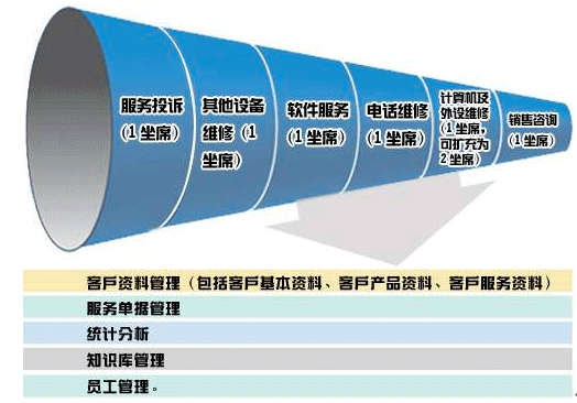 每個(gè)模塊大致都有如下功能:客戶資料管理(包括客戶基本資料、客戶產(chǎn)品資料、客戶服務(wù)資料),服務(wù)單據(jù)管理,統(tǒng)計(jì)分析,知識(shí)庫(kù)管理,員工管理。但每個(gè)模塊所需記錄的內(nèi)容、服務(wù)處理流程不盡相同。