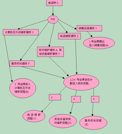 在交互式語(yǔ)音應(yīng)答系統(tǒng)IVR的幫助下,各服務(wù)流程有條不紊地進(jìn)行,每個(gè)職能部門管理自己部門的流程,提供全方位的客戶所要求的服務(wù)。下面我們以銷售咨詢?yōu)槔,看看這個(gè)簡(jiǎn)單的工作流程。