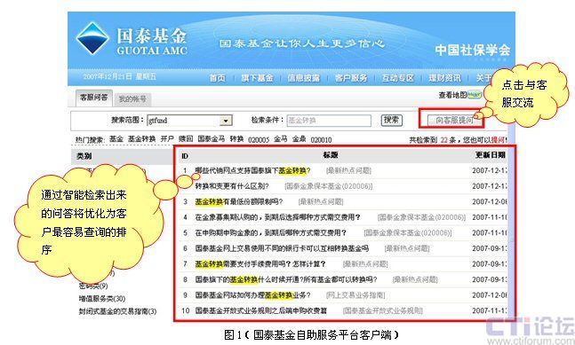 國(guó)泰基金成立于1998年3月5日,是國(guó)內(nèi)按照規(guī)范化要求成立的首批基金管理公司之一,注冊(cè)資本為1.1億,總部位于上海。贏得了包括封閉式和開放式基金近150萬持有人的信任,成為了一家市場(chǎng)信譽(yù)良好、具有較高知名度的專業(yè)證券投資管理公司,得到社會(huì)中介機(jī)構(gòu)的諸多肯定。日前,該公司運(yùn)用53IQ客戶自助服務(wù)系統(tǒng),進(jìn)一步拓展客戶服務(wù)方式,實(shí)現(xiàn)了先進(jìn)的客戶關(guān)系管理。