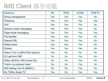 已經(jīng)實(shí)現(xiàn)的IMS業(yè)務(wù)有:組群管理,IPTV,IM即時消息,Push-to-talk POC,視頻會議,文件傳送,交互游戲,協(xié)同工作(白板應(yīng)用)等等