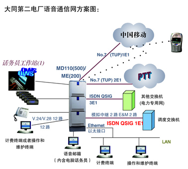大同第二發(fā)電廠二期擴建需要建設一個新的語音交換系統(tǒng),既用于電廠內行政通信,又可以成為廠內和公網語音通信匯接中心。