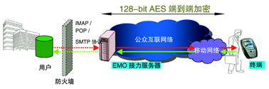 鑒于用戶目前正使用互聯網郵件系統(tǒng),愛立信提供了EMO Email Push互聯網版解決方案。方案需要將Email Push應用的用戶在愛立信EMO接力服務器上注冊,同時在用戶的手機上安裝客戶端軟件即可;