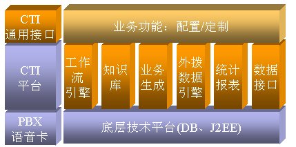 客戶服務(wù)系統(tǒng)由接入平臺(tái)和應(yīng)用軟件兩部分組成。接入平臺(tái)包括硬件接入設(shè)備,CTI中間件;應(yīng)用軟件實(shí)現(xiàn)咨詢、查詢、業(yè)務(wù)受理、投訴、故障申告及外呼服務(wù)等功能。