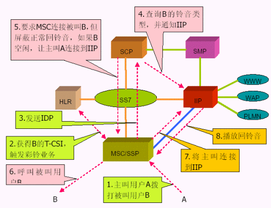 3. 智能網(wǎng)方式使用移動智能網(wǎng)中的信令控制節(jié)點(SCP)實現(xiàn)智能業(yè)務(wù)的業(yè)務(wù)邏輯,新增的智能外設(shè)用于為用戶提供回鈴音和用戶管理功能。 個性化回鈴音業(yè)務(wù)是基于智能網(wǎng)系統(tǒng)的一個新業(yè)務(wù),在智能網(wǎng)中增加新的業(yè)務(wù)控制點(SCP)和獨立智能外設(shè)(IIP)。為此只需要為此業(yè)務(wù)加入基于Intel平臺的SCP和IP即可,前者是智能網(wǎng)體系中的業(yè)務(wù)控制設(shè)備,用于實現(xiàn)智能業(yè)務(wù)的業(yè)務(wù)邏輯,使用的是Intel高性能的c-PCI平臺,支持高可靠性的冗余備份,提供業(yè)務(wù)呼叫控制和業(yè)務(wù)數(shù)據(jù)維護(hù)功能;后者是智能網(wǎng)獨立外設(shè),使用的是Inetl Dialogic的相關(guān)語音板卡,用于為個性化回鈴音用戶提供語音(回鈴音)、以及業(yè)務(wù)管理等功能。優(yōu)點是無須改動現(xiàn)網(wǎng)上MSC/SSP 的軟件,通過采用SCP 查詢被叫用戶狀態(tài)的方式,只有當(dāng)被叫用戶處于空閑的情況下,才使用IIP 進(jìn)行處理,可以減少系統(tǒng)負(fù)荷,降低SSP 與IIP 之間話路的占用。缺點是需要MSC支持智能網(wǎng)業(yè)務(wù)。