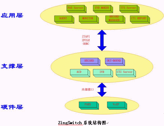 在以上三層結(jié)構(gòu)中,前兩層與具體業(yè)務(wù)系統(tǒng)無關(guān)。上層業(yè)務(wù)系統(tǒng)的多種變化,不會影響下層的穩(wěn)定;而下層規(guī)范地進(jìn)行優(yōu)化和擴(kuò)展后,上層的所有應(yīng)用都可在業(yè)務(wù)功能上得到擴(kuò)展。這樣,用戶的業(yè)務(wù)應(yīng)用系統(tǒng)自身可以有多種功能和性能的變動和擴(kuò)展,同時,當(dāng)基于ZingSwitch一體化交換機(jī)的呼叫中心系統(tǒng)平臺在進(jìn)行擴(kuò)容、升級的時候,原來已經(jīng)無縫掛接其上的用戶的業(yè)務(wù)應(yīng)用系統(tǒng)也無需任何更改即可運行。