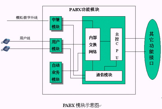 PABX模塊采用了三級分布分散的控制方式,這三級由主控板級、通訊控制級和各功能模塊級組成。各功能模塊單板實現(xiàn)各功能板的自身控制,通訊控制級模塊主要負(fù)責(zé)主控板級和各功能模塊級之間的數(shù)據(jù)通訊,實現(xiàn)主控板對各功能模塊的協(xié)調(diào)和控制。模塊內(nèi)部采用了先進(jìn)的內(nèi)存管理技術(shù)、先進(jìn)的通信方式和先進(jìn)的控制方式,因而獲得了極高的CPU通訊帶寬和處理能力。