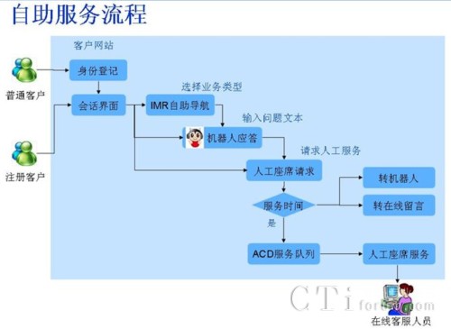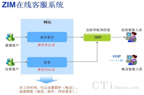 客戶從網(wǎng)站設(shè)定的多個(gè)入口訪問企業(yè)在線客服,系統(tǒng)同時(shí)進(jìn)行客戶身份認(rèn)證,客戶可以選擇訪客或注冊(cè)用戶身份訪問在線客服系統(tǒng)(如銀行的網(wǎng)銀客戶不需要客戶輸入身份直接進(jìn)入系統(tǒng)),客戶以不同的身份訪問在線客服系統(tǒng),關(guān)系到在轉(zhuǎn)人工座席時(shí)ACD的路由策略、技能組座席服務(wù)定位、客戶既往服務(wù)信息的完整和個(gè)性化服務(wù)的體現(xiàn)。