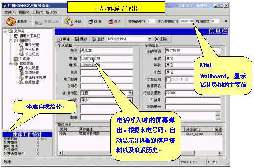 當(dāng)客戶的電話被轉(zhuǎn)到客戶服務(wù)人員時,客戶的所有相關(guān)信息將自動彈出顯示在服務(wù)人員的電腦屏幕上,包括歷史接觸記錄信息等,這樣就能提供最具有針對性和高效率的服務(wù)。如果是新客戶,那么服務(wù)人員將即時錄入信息,動態(tài)擴(kuò)充數(shù)據(jù)庫。
