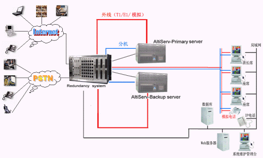 奧迪堅(jiān)通訊系統(tǒng)有限公司作為CTI通訊平臺的提供商,在技術(shù)上不斷創(chuàng)新,對產(chǎn)品精益求精,尤其體現(xiàn)在對系統(tǒng)的運(yùn)行安全性的要求上,為了防止電信接入設(shè)備或者企業(yè)網(wǎng)絡(luò)出現(xiàn)故障而造成的呼叫中心服務(wù)中斷,奧迪堅(jiān)呼叫中心系統(tǒng)提供安全保護(hù)冗余切換系統(tǒng),來保障呼叫中心在意外情況下的正常工作,該安全冗余切換系統(tǒng)通過對電源、T1/E1、模擬trunk、分機(jī)座席、以及各種網(wǎng)絡(luò)鏈路串口等備份切換來實(shí)現(xiàn)可靠的運(yùn)行。除此之外,奧迪堅(jiān)系統(tǒng)本身也提供強(qiáng)大的安全保障,由于采用先進(jìn)IP內(nèi)核一體化設(shè)計(jì),集傳統(tǒng)PBX、CTI服務(wù)器、IVR、ACD、Recording、FAX等眾多設(shè)備于一體,這樣有效的避免了因?yàn)橥鈷煸O(shè)備過多以及設(shè)備供應(yīng)商的不同而存在的兼容性的問題,從而降低了給呼叫中心系統(tǒng)帶來的的不穩(wěn)定的安全隱患。在系統(tǒng)之外依靠安全保護(hù)冗余切換系統(tǒng),可以實(shí)現(xiàn)外線、分機(jī)、以及各種鏈路接口的雙倍安全運(yùn)行。如上圖所示:兩臺奧迪堅(jiān)的呼叫中心服務(wù)器和奧迪堅(jiān)安全冗余切換系統(tǒng)構(gòu)成呼叫中心熱備份系統(tǒng),在兩臺服務(wù)器中安裝所有的呼叫中心功能模塊。通常情況下由主呼叫中心服務(wù)器提供系統(tǒng)的正常運(yùn)行,備份服務(wù)器通過安全保護(hù)冗余切換系統(tǒng)的服務(wù)監(jiān)測模塊來監(jiān)測主服務(wù)器的各項(xiàng)設(shè)備和鏈路的使用情況,當(dāng)主服務(wù)器遭遇突發(fā)故障不能繼續(xù)工作時(shí),系統(tǒng)馬上實(shí)施自動(dòng)切換,就會(huì)通過安全保護(hù)冗余切換系統(tǒng)將系統(tǒng)切換到備份的呼叫中心系統(tǒng)上來,此鏈路可以是數(shù)據(jù)、語音、網(wǎng)絡(luò)、串口等。當(dāng)安全保護(hù)冗余切換系統(tǒng)自身出現(xiàn)斷電或者其他故障時(shí),所有鏈路均保持正常工作狀態(tài)。
