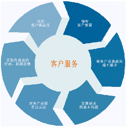 客戶服務(wù)不僅限于把公司提供給客戶使用?蛻舴⻊(wù)是與客戶交互的一個完整過程,包括聽取客戶的問題和要求,對客戶的需要作出反應(yīng)并探詢客戶新的需求。我們真的不能將其看成一個簡單的過程。客戶服務(wù)可以用一個復(fù)雜的循環(huán)來表示,其中不僅僅包括了客戶和客戶服務(wù)部門,實際上包括了整個公司,即把公司整體作為一個受客戶需求驅(qū)動的對象。