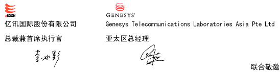 屆時,不僅有Genesys全球總裁率領(lǐng)資深專家向您介紹客戶關(guān)系管理領(lǐng)域的市場動向與未來趨勢,還帶來了全球拭目以待、發(fā)熱發(fā)光的Genesys最新產(chǎn)品 ── G7。此外主辦單位更有幸請來兩岸三地知名客戶,提供商務(wù)應用實例,共同分享其成功經(jīng)驗,為您的企業(yè)及同行業(yè)提供了相互交流的機會。