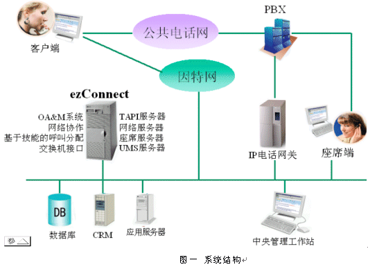 為了充分發(fā)揮現(xiàn)有系統(tǒng)的潛在能力,集成世界一流的產(chǎn)品以最大限度為客戶服務,因特網(wǎng)呼叫中心的發(fā)展需要具備與多種系統(tǒng)交互的能力,充分發(fā)揮各種軟硬件的長處。電話和因特網(wǎng)呼叫中心解決方案ezConnect是按照工業(yè)標準設計的系統(tǒng),系統(tǒng)基于Windows NT操作系統(tǒng),采用廋客戶端設計思想設計,使用業(yè)界流行的Visual C++ 和Java實現(xiàn),可以作為開發(fā)平臺做二次開發(fā),也可以經(jīng)參數(shù)配置后直接投入使用。