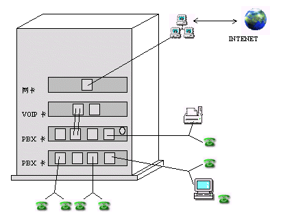 圖中假設客戶安裝了兩塊PBX板卡和一塊VOIP板卡,產品的板卡都插在計算機主板上的插槽上。系統的布線如圖所示,PBX板卡上有外線端口和分機端口(ISA型號的每個插口接4條線、PCI型號的每個插口接2條線),外線接在外線端口上,分機線接在分機端口上。VOIP板卡有2個插口,每個插口接2條線。用戶如果要使用VOIP功能,需要從分機端口接出線到VOIP端口中?蛻羰褂镁W絡電話時,只要呼叫連接VOIP端口的分機號碼即可撥通網絡電話。
