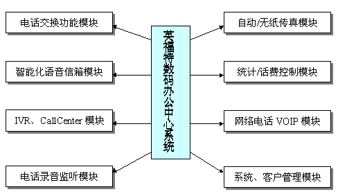 模塊包括:一號通功能、語音留言、留言通知功能、客戶通過密碼遠程登錄控制功能、與電子郵件集成的語音郵件(Voice Mail)系統、群組廣播功能等功能。