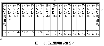 見圖2和3,遠(yuǎn)端模塊采用19英寸標(biāo)準(zhǔn)機(jī)框,高度為5U,可安裝在各種標(biāo)準(zhǔn)的19英寸的機(jī)柜中。機(jī)框共20個(gè)插槽,正面插板,反面背板出線。每個(gè)機(jī)框可插20塊各種類型的板件,其中兩邊第1第20槽固定插電源板PSU,中間第10號(hào)槽固定插數(shù)字中繼接口板HDT4,其余16個(gè)槽為通用槽口,可插16塊各種類型接口板。每塊板為8路,一個(gè)機(jī)框總共128話路。調(diào)度接口板2RDU固定插第11槽,該板不占機(jī)框端口。對(duì)于自帶交換系統(tǒng),需要安裝一塊系統(tǒng)信號(hào)音板8TDU,該板固定插19槽,占8個(gè)端口。