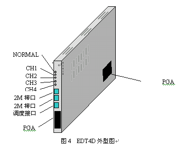 EDT4D是在舊EDT4板上增加調(diào)度接口。見圖4,EDT4D為一塊H20-20交換機(jī)插板,厚度為兩個(gè)槽口。EDT4通過扁平電纜與交換機(jī)公共控制機(jī)柜的背板PGA相連,提取交換機(jī)時(shí)隙;并將時(shí)隙轉(zhuǎn)換為由四個(gè)數(shù)字中繼接口E1組成的準(zhǔn)V5.2接口與遠(yuǎn)端模塊相連。一塊EDT4可接2個(gè)PGA端口組,共128個(gè)話路。