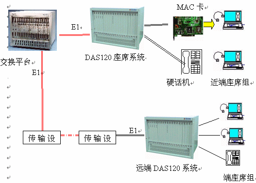 DAS120交換平臺采用1-4個E1連接,可以簡潔實現(xiàn)PCM信號轉模擬信號引出到座席。E1接口的信令可選配為隨路信令CAS和透明通道Clear Channel。E1可通過光端機、微波、HDSL等設備來傳輸,從而實現(xiàn)分布式組網(wǎng)。