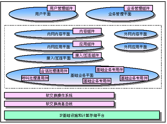 從結(jié)構(gòu)上看,業(yè)務(wù)驅(qū)動(dòng)的軟交換平臺(tái)是一個(gè)復(fù)雜的多域多層組件平臺(tái)。一個(gè)電信業(yè)務(wù)的實(shí)現(xiàn)是對(duì)平臺(tái)上的組件的組裝過程。業(yè)務(wù)驅(qū)動(dòng)的軟交換平臺(tái)上的組件分為用戶平面、基礎(chǔ)業(yè)務(wù)平面、接入/互連/移動(dòng)控制平面、應(yīng)用平面、內(nèi)容平面和業(yè)務(wù)管理平面。用戶平面的組件負(fù)責(zé)維護(hù)用戶的注冊(cè)信息、位置信息、狀態(tài)信息、業(yè)務(wù)信息和業(yè)務(wù)使用信息。基礎(chǔ)業(yè)務(wù)平面的組件分為三大類型:電路基礎(chǔ)業(yè)務(wù)、包交換基礎(chǔ)業(yè)務(wù)和多媒體交換基礎(chǔ)業(yè)務(wù)。每個(gè)基礎(chǔ)業(yè)務(wù)分成傳輸層、承載層、媒體層、呼叫處理層和業(yè)務(wù)層,其中的控制包括了對(duì)各層功能的控制協(xié)議和層間交互的控制協(xié)議。接入/互連/移動(dòng)控制平面中包含了對(duì)各種接入網(wǎng)絡(luò)的控制、對(duì)互聯(lián)網(wǎng)絡(luò)的控制和對(duì)移動(dòng)性的控制協(xié)議,也分成傳輸層、承載層、媒體層、呼叫處理層和業(yè)務(wù)層的控制組件。應(yīng)用平面的組件分為三種類型,基于傳統(tǒng)智能網(wǎng)(IN,