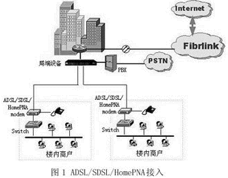中電飛華在光纖(或其他專線)接入的基礎(chǔ)上提供樓宇、小區(qū)的整體接入解決方案,即在光纖接入到樓宇和小區(qū)之后,通過(guò)各種接入手段將樓內(nèi)商業(yè)用戶、小區(qū)個(gè)人用戶等接入Internet。根據(jù)樓內(nèi)/間布線情況采用不同的接入方法,包括ADSL、SDSL、HomePNA接入以及以太網(wǎng)接入等。