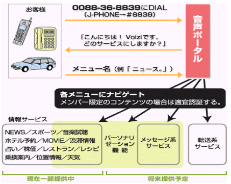 首先撥星號*(0088-36-8839,J-PHONE是#8839),接通后則是VOIZI主菜單,在電話員小姐的導播之后您可說出您希望的菜單,即可連接。之后再根據(jù)導播說出自己的希望,繼續(xù)進行使用。