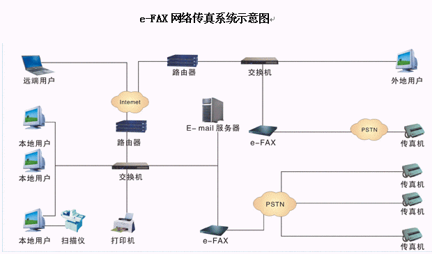 e-FAX網(wǎng)絡(luò)傳真機(jī) 的工作原理是利用內(nèi)部設(shè)備對傳真和語音信號的存儲及轉(zhuǎn)換功能,在網(wǎng)絡(luò)配置許可的范圍內(nèi) , 主要實現(xiàn)了自動接收和發(fā)送傳真的功能。系統(tǒng)內(nèi)用戶能通過電子郵件和網(wǎng)頁方式收取自己的傳真或語音,發(fā)送傳真時只需要提交傳真給傳真服務(wù)器,服務(wù)器能自動發(fā)送。系統(tǒng)外用戶能在語音流程的提示下發(fā)送或接收傳真,也可以選擇發(fā)送留言信息。系統(tǒng)管理員則可以對系統(tǒng)進(jìn)行參數(shù)配置,流程定制和用戶信息管理等功能操作。