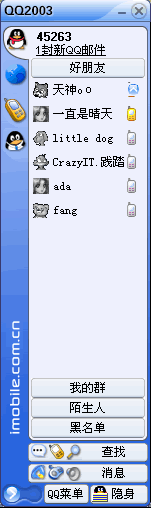 從主界面來看,MSN Messenger 6.0基本沒有改變,而QQ2003則新增加了QQ短信和QQ游戲兩個按紐,同時增加了QQ郵件提示,這和MSN