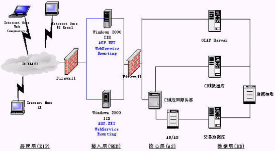 展現(xiàn)層實(shí)現(xiàn)定制化的、支持各種接入設(shè)備的統(tǒng)一消息平臺是非常必要的,它必將極大地促進(jìn)公司服務(wù)產(chǎn)品的發(fā)展。在展現(xiàn)層我們還強(qiáng)調(diào)企業(yè)信息門戶的建立:信息不是孤立的,需要一個(gè)統(tǒng)一的、互動的、個(gè)性化的、全面的綜合表現(xiàn)形式,以更方便公司人員對信息的獲取,作出正確的決策。使用ASP.Net和OfficeXP Web Components OLAP展示工具,并能有機(jī)的與辦公自動化工具結(jié)合起來。