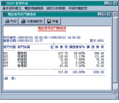 - 提供單獨(dú)、全部或自定范圍之分機(jī)電 話(huà)帳、部門(mén)電話(huà)帳之電話(huà)明細(xì)報(bào)表。