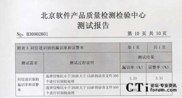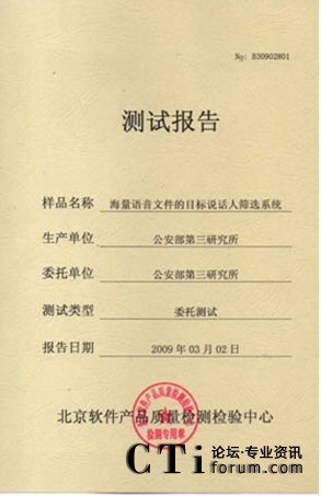CTI論壇(ctiforum)06月25日消息: 2009年3月02-10日:北京軟件產(chǎn)品質(zhì)量檢測(cè)檢驗(yàn)中心對(duì)《海量語(yǔ)音文件的目標(biāo)說(shuō)話人篩選系統(tǒng)》進(jìn)行了全面測(cè)試包括用戶文檔、功能性、可靠性、易用性、可維護(hù)性等多個(gè)特性。測(cè)試結(jié)果表明《海量語(yǔ)音文件的目標(biāo)說(shuō)話 2009年3月02-10日,北京軟件產(chǎn)品質(zhì)量檢測(cè)檢驗(yàn)中心對(duì)《海量語(yǔ)音文件的目標(biāo)說(shuō)話人篩選系統(tǒng)》進(jìn)行了全面人篩選系統(tǒng)》滿足軟件相關(guān)國(guó)家標(biāo)準(zhǔn)中的要求,系統(tǒng)在模擬測(cè)試環(huán)境中運(yùn)行正常、穩(wěn)定,正式通過(guò)北京軟件產(chǎn)品質(zhì)量檢測(cè)檢驗(yàn)中心的嚴(yán)格測(cè)試,系統(tǒng)的漏識(shí)率和誤警率分別達(dá)到了2.81%和 2.81%。