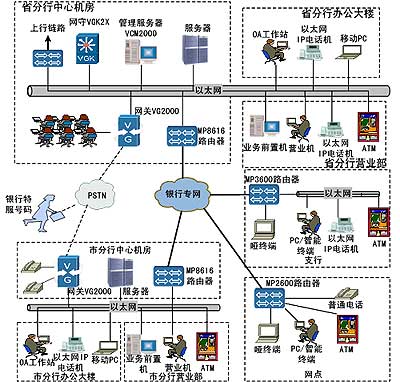邁普的方案是在省分行放置MyPower VGK2X IP電話網(wǎng)守和MyPower VCM2000呼叫管理服務(wù)器,在省分行和地市分行一級(jí)采用MyPower
