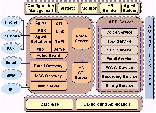 Server負責將這些信息收集在一起,供應用服務器使用;同時VoiceServer和CTI Server同時將各種數據和信息進行解釋,將任務提交給各種硬件和接入設備執(zhí)行。