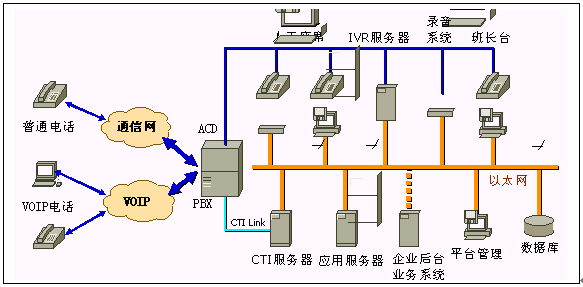 ·CTI服務(wù)器:將電話交換系統(tǒng)和計算機(jī)系統(tǒng)有機(jī)地結(jié)合起來