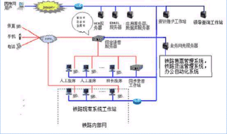 客戶利用電話、傳真、電子郵件、因特網(wǎng)、手機(jī)、網(wǎng)絡(luò)電話等撥打某統(tǒng)一特服號碼(如100xxxx)進(jìn)入鐵路客戶服務(wù)中心系統(tǒng),本系統(tǒng)依托鐵路各類業(yè)務(wù)技術(shù)支持系統(tǒng)和網(wǎng)絡(luò)系統(tǒng),通過人工受理或自動語音服務(wù)等方式全天24小時(shí)不間斷地為旅客、貨主提供各種鐵路服務(wù);形成了對外服務(wù)于客戶,對內(nèi)管理、分析、決策系統(tǒng)相結(jié)合的新型客戶服務(wù)中心。