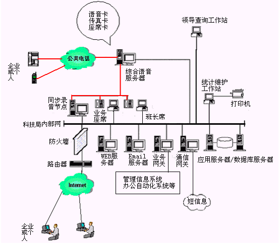 應(yīng)用現(xiàn)代先進(jìn)的CTI技術(shù)建立的科技局公開電話系統(tǒng),改變了傳統(tǒng)的科技局辦公的一部電話、一支筆、一個(gè)本(或用計(jì)算機(jī)當(dāng)打字機(jī))的記錄、交流模式。在充分利用各級科技局現(xiàn)有辦公自動(dòng)化系統(tǒng)基礎(chǔ)上,通過共享科技局、社會網(wǎng)絡(luò)資源,能夠?yàn)槠髽I(yè)或個(gè)人提供了更多、更好、更便捷的服務(wù)。