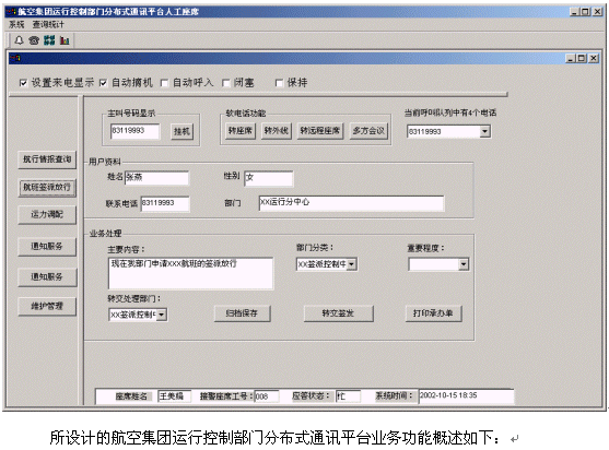 航空集團運行控制部門分布式通訊平臺系統(tǒng)的軟件設計采用業(yè)界先進的三層CLIENT/SERVER體系結(jié)構(gòu),集目前先進的計算機技術、通信技術、計算機電信集成(CTI)技術、呼叫接入技術、智能接入交換分配技術、數(shù)字語音處理技術、異構(gòu)系統(tǒng)信息交互技術、安全容錯技術、網(wǎng)絡組網(wǎng)技術等于一體,并與航空集團運行控制部門已有技術支持系統(tǒng)(如飛行運行控制系統(tǒng)、航路計劃系統(tǒng))緊密結(jié)合在一起,突破時空的限制,通過人工座席、自動語音/傳真、相關部門工作人員等為集團內(nèi)部提供電話、傳真服務形式的周到、快捷、全方位的通信服務。