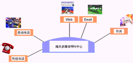 客戶利用電話、傳真、電子郵件、因特網(wǎng)、手機等撥打某一特服號碼(如9xxxx)進(jìn)入海關(guān)多媒體呼叫中心系統(tǒng),本系統(tǒng)依托海關(guān)緝私相關(guān)的MIS系統(tǒng)、OA度系統(tǒng)等各類業(yè)務(wù)技術(shù)支持系統(tǒng)和網(wǎng)絡(luò)系統(tǒng),通過自動語音服務(wù)或人工受理等方式全天24小時不間斷地為客戶提供各種服務(wù)。