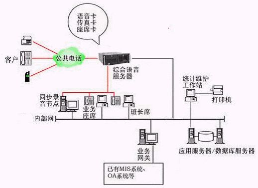 本系統(tǒng)物理結(jié)構(gòu)由帶語(yǔ)音板卡的高性能工控機(jī)(稱(chēng)為綜合語(yǔ)音服務(wù)器,在功能上可以分為CTI服務(wù)器、IVR(交互式語(yǔ)音應(yīng)答)/IFR服務(wù)器、統(tǒng)計(jì)維護(hù)管理工作站、數(shù)據(jù)庫(kù)/應(yīng)用服務(wù)器、錄音留言工作站、業(yè)務(wù)網(wǎng)關(guān)服務(wù)器、業(yè)務(wù)代表座席、網(wǎng)絡(luò)系統(tǒng)等和應(yīng)用軟件構(gòu)成。