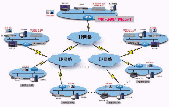 中國人民財產(chǎn)保險股份有限公司,是中國內地最大的非壽險公司,香港證交所上市公司。經(jīng)過50多年的發(fā)展,中國人保財險公司已經(jīng)發(fā)展成為網(wǎng)點遍布全國31個省市區(qū),共有營業(yè)機構4000余個的大型商業(yè)公司。為提高辦公效率,降低差旅成本,中國人保財險公司決定建設覆蓋從總公司、省分公司到地市分公司的視頻會議系統(tǒng),項目總容量達600多個節(jié)點,采用兩級級連方式組網(wǎng),要求系統(tǒng)具備視頻、音頻、數(shù)據(jù)交互功能,。